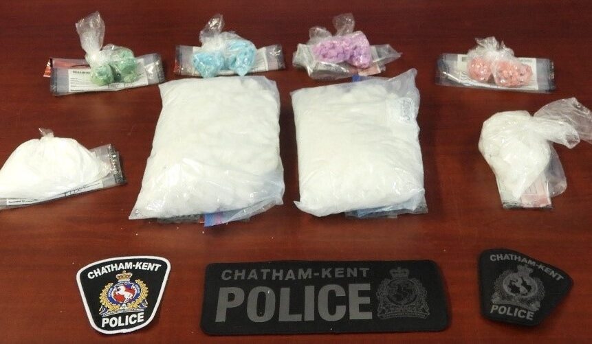 Following a search of her vehicle, officers also seized 129.73 grams of cocaine, 1,986.74 grams of methamphetamine, and 221.99 grams of fentanyl with a total estimated street value of $187,674.90. Police also seized $1,870 in Canadian currency, two digital scales, a prohibited weapon, and a gold watch.